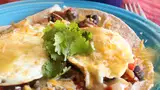 - Step 7:To assemble huevos rancheros: Place cheese-filled tortillas on four serving plates. Top each tortilla with black bean mixture, a layer of salsa, and an egg. Serve immediately.